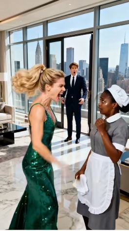 Gabriel froze in the doorway. In the center of the room, a young woman wearing a worn uniform clutched a broom, her knuckles white. Tears shimmered against her dark skin.