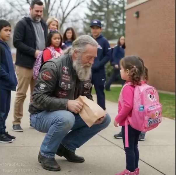 The principal explained that Lily had been sneaking away each morning to meet a heavily tattooed biker at the edge of school property, giving him her lunch. To the adults, it sounded terrifying. To Lily, it was something else entirely.