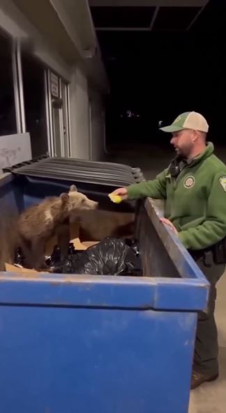 Just saw a video I can’t stop thinking about. A starving bear cub, all ribs and hesitation, climbs into a dumpster behind a closed gas station—just trying to survive. Then a wildlife officer shows up. No sirens, no shouting. Just quiet. He kneels down and holds out a piece of fruit. The cub freezes, scared. Then… a sniff. A pause. And slowly, it takes the food. That moment—so small, but it wrecked me. Not all heroes chase headlines. Some just show up, gently, when the wild is hurting and hope is all that’s left.