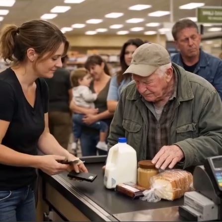 Ahead of me, an elderly man in a faded navy jacket stood in the express lane. He placed three items on the conveyor belt: bread, milk, and peanut butter. Simple. Basic. Careful purchases for someone counting every penny.