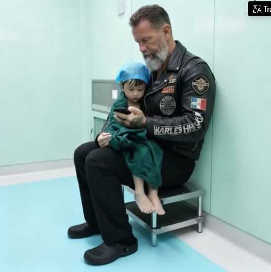 Then something unexpected happened. Liam lifted his head and looked across the room. His eyes stopped on a large man sitting alone in the corner — a biker. He wore a black leather vest covered in patches. Tattoos covered both arms. His beard was thick, his boots heavy, and his expression unreadable. He looked like someone who belonged on the open road, not in a pediatric ward.