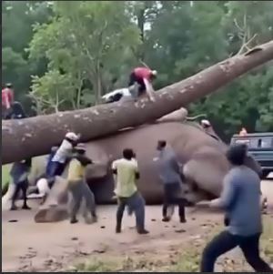 In a heart-stopping incident, a majestic elephant found itself in a perilous situation when a massive tree fell upon it.