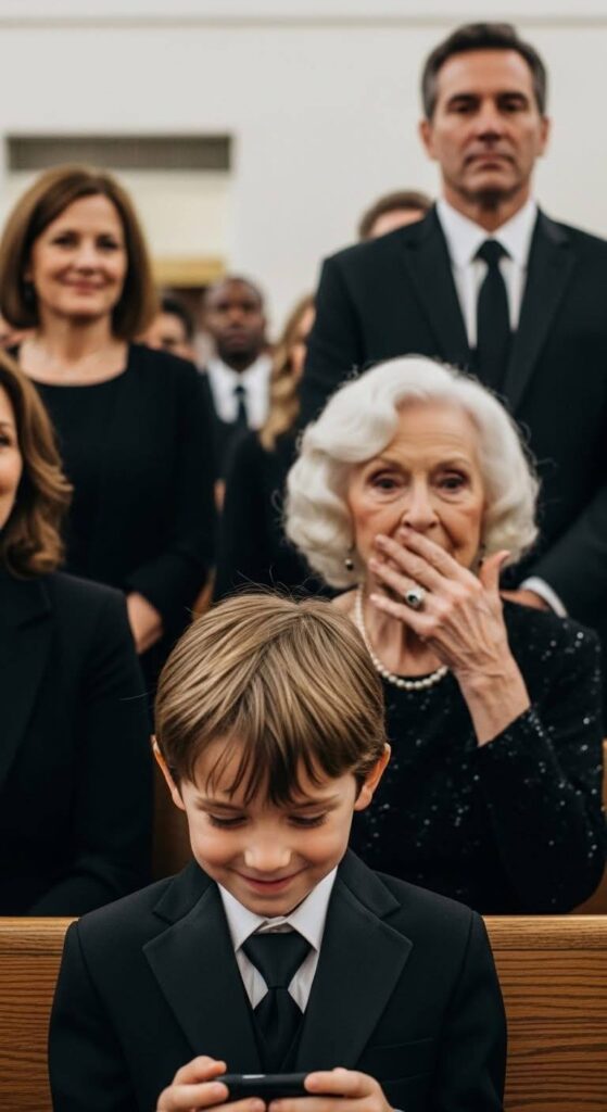At my husband’s funeral, his mother said, “At least he died before living with her shame any longer.” Relatives nodded. My eight-year-old son stood up, holding his dad’s phone. “Grandma,” he asked, “should I show everyone what Dad recorded about you last week?” Her face went white.