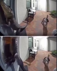 Then the unexpected happened. One gator rose onto its hind legs and pressed its snout against the front door — almost like a polite guest asking to enter. The second gator paced behind, watching.