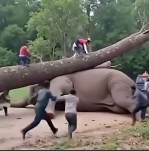 A tree has fallen on an elephant and many people are trying to remove the tree #shortvideo #elephant