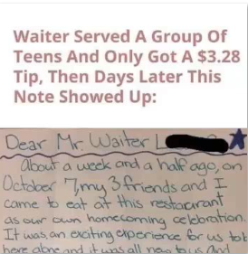 But when the bill arrived, the tip left behind was just $3.28 — a painful oversight for someone whose livelihood depends on gratuities.
