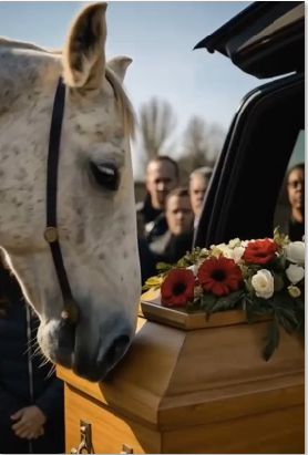 Gasps rippled through the crowd as he approached, his mane tangled, his coat streaked with mud, his body trembling with exhaustion. Yet his dark eyes locked on one thing — the coffin.