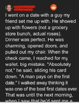 When the check came, he insisted, “A man pays on the first date.” I agreed, thinking I’d met a true gentleman.