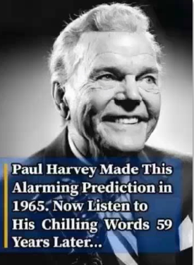 I used to listen to Paul Harvey with my mom in the ‘70s. He was always spot-on with what he said. Everything he predicted 54 years ago is happening right now! Watch it Below