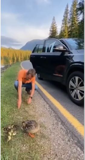 A compassionate man stopped on a scenic road to provide water to a sick mother duck surrounded by her chicks.