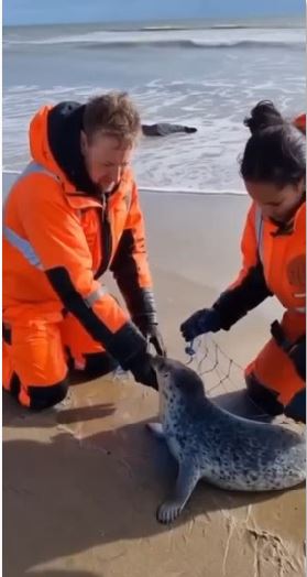 On a cold, wet shoreline, a small seal pup was found in life-threatening danger. It was helplessly tangled in the unforgiving mesh of a discarded fishing net, unable to move or follow its mother. The concerned mother seal watched from a short distance, her dark eyes filled with a worry that transcended species.