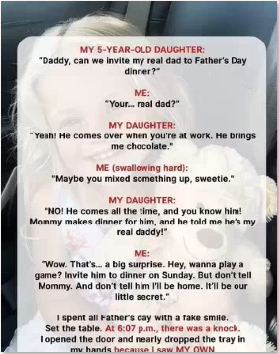fingers still stained with crayon, asked, “Daddy, can we invite my real dad to dinner on Sunday?” Her words hit like thunder.