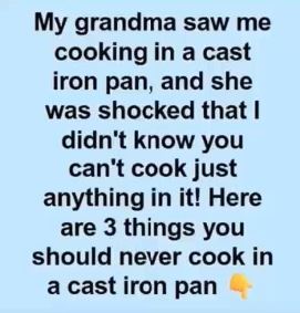 She walked into the kitchen, spotted what I was doing, and shook her head with a mix of surprise and amusement. “You can’t cook just anything in a cast iron pan,” she said. I laughed at first, thinking she was joking, but then she sat me down and explained why. Acidic foods, like tomato sauces, can eat away at the seasoning she’d spent years building up.
