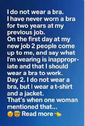 When I started my new job, I didn’t expect my wardrobe to become a topic of debate. On my very first day, two coworkers told me I should wear a bra—that what I had on was “inappropriate.” I was stunned. I had never dressed unprofessionally; my clothes were neat, modest, and comfortable. Still, on Day 2, I showed up again without one—this time in a T-shirt and jacket. That’s when a quiet woman approached me, not to criticize, but to warn me gently. “Some people here are quick to judge,” she said. “But don’t let them make you feel small. Just be sure you’re comfortable and professional, and let your work speak louder than their opinions.”