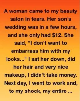 She walked into my salon just after sunrise, her hands trembling and eyes red from tears. Clutching a worn purse, she whispered, “My son’s wedding is in a few hours. I don’t want to embarrass him.” She counted twelve dollars — all she had. Without hesitation, I guided her to a chair and said softly, “Let’s make you feel like a queen today.” Her name was Mirela. Her hair had dulled, her hands showed years of work, and her eyes carried quiet sorrow. As I styled her hair and added gentle makeup, I realized it wasn’t just about beauty — it was about helping her rediscover herself.