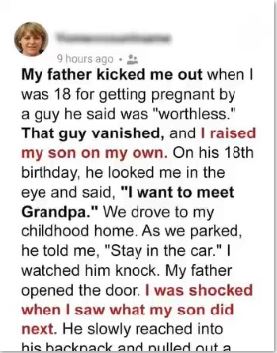 I was seventeen when my world changed forever. One moment I was a scared girl holding a secret, and the next, I was being pushed out of the only home I’d ever known. When I told my father I was pregnant, he didn’t yell or argue — he simply opened the door and told me to leave. No hug, no goodbye, just silence and a porch light fading behind me. I stood there with a duffel bag and a life growing inside me, realizing that a single moment could erase years of belonging. Eighteen years later, that life — my son — stood at that same doorstep with a message my father would never forget.