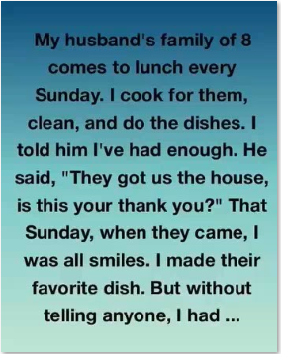 For three years, every Sunday at noon, my home filled with my husband’s family—eight people expecting food,