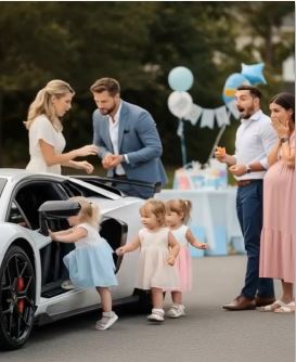 The day of the event, sunlight shimmered across the country club’s white stone walls. I stepped out of a white Lamborghini — Ethan’s idea, not mine — balancing Ruby on my hip while Ava, Noah, and Liam tumbled out behind me, chattering and full of energy.