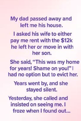 When my father passed away, I inherited more than his home — I inherited the weight of a difficult decision. The house was filled with memories, but it also came with financial strain: taxes, maintenance, and repairs I couldn’t easily afford. My stepmother, his wife, was still living there, and I had to decide what was fair — to let her stay indefinitely or to take responsibility for a property that was quickly becoming a burden. My father had left her $12,000, and I asked that she contribute to rent or move in with her son. Through tears, she said, “This was my home for years! Shame on you.” I tried to explain, but she refused any compromise. When she finally left, she also left behind silence — and I carried that guilt with me for years.