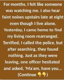 For weeks, I couldn’t shake the strange feeling that someone was watching me. It wasn’t full-blown fear, just a quiet unease that crept into the stillness of my home. At night, faint creaks echoed from upstairs — too soft to be alarming, yet too intentional to dismiss. My reflection in the dark window felt unfamiliar, almost observant. I told myself it was stress or imagination, but one afternoon I came home to find the armchair shifted and my books rearranged. My chest tightened. Convinced someone had been inside, I called the police.