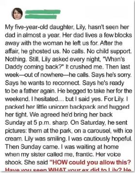 The next day, the photos disappeared from his page, but the truth stayed with me. This wasn’t about Lily’s happiness — it was about his image. Now Lily is home again, laughing, comfortable, and secure. I’ve made it clear that he won’t have unsupervised visits until he can show he understands what being a parent truly means. Love isn’t about appearances or attention. It’s about being there, with honesty, respect, and care. And that’s what Lily will always have from me.