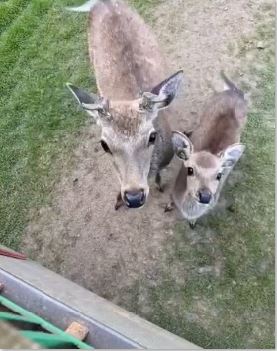 The morning seemed completely ordinary until two deer emerged from the edge of the woods and quietly watched as I spread hay. Their calm presence immediately caught my attention, so different from the quick, cautious movements I usually saw. One stayed partly hidden among the trees, while the smaller one looked directly at me with gentle curiosity. For a brief moment, we simply observed each other in the stillness of the field.