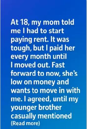 Years later, things changed when my mom, now retired and experiencing financial difficulties, asked if she could move in with me. I agreed without hesitation. Soon after, my younger brother mentioned that he had never been asked to pay rent when he lived with her. His comment surprised me and made me reflect on those earlier years, leaving me with questions about why our experiences had been different.