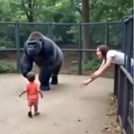 In a heartwarming moment at a local zoo, a gorilla known for its gentle nature became an unlikely guardian. The scene captured on video quickly spread across the internet, touching hearts worldwide. The gorilla, with surprising tenderness, carefully lifted the lost baby and returned the child safely to the anxious mother’s arms—an instinctive act of kindness that spoke volumes.