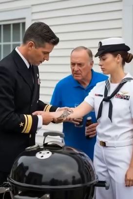 The barbecue was typical suburban theater—folding chairs, cheap beer, and men with military pasts pretending civilian life wasn’t choking them. I hadn’t been home in a year, arriving straight from a D.C. change-of-command ceremony, still in dress whites. The ribbons on my chest caught the sunlight, signaling more than my father realized.
