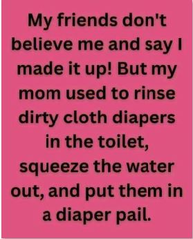 Back before disposable diapers, parents had a gritty routine: my mom would rinse dirty cloth diapers in the toilet, wring them out, and toss them in the diaper pail until wash day. Wild, messy, and resourceful—old-school parenting was no joke! Did your family do this too?