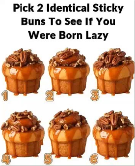 Six caramel-drizzled sticky buns topped with pecans make up today’s playful puzzle: find the two that are identical.